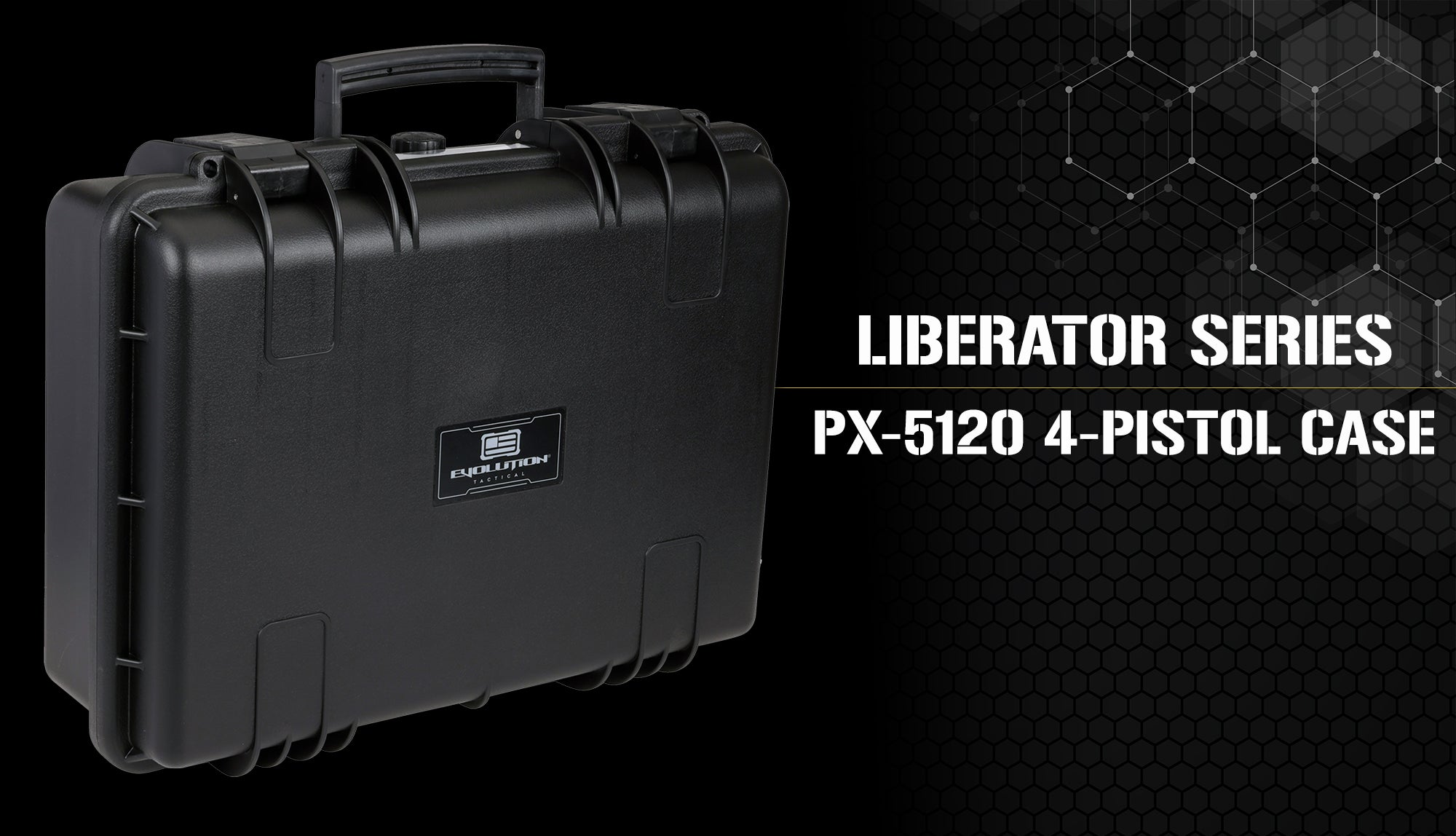 The Liberator PX-5120 is a heavy-duty hard case built to securely carry up to four pistols and their accessories. Its impact-resistant shell and gasket-sealed design lock out water, dust, and debris for dependable all‑weather protection. Precision pick‑n‑pluck foam creates a snug, custom fit to prevent shifting, while robust lockable latches, corrosion‑resistant hardware, a pressure‑equalization valve, and reinforced hinge deliver travel‑ready security. Built for shooters who demand toughness and peace of mind, the PX-5120 stands up to rough handling and harsh conditions.