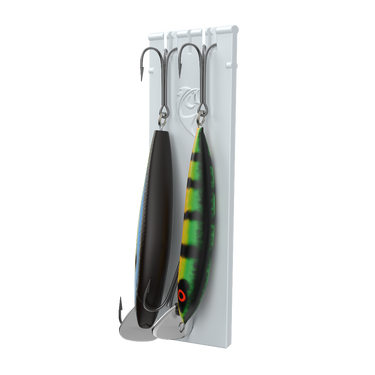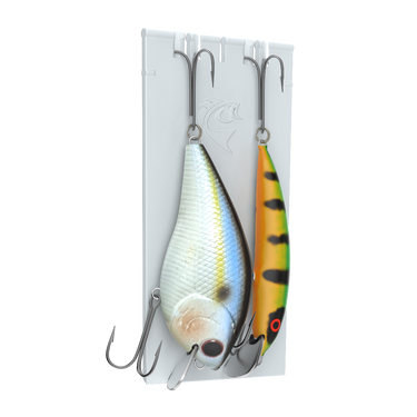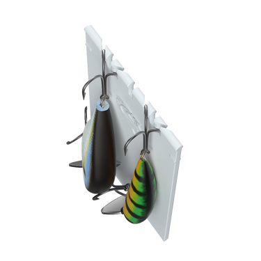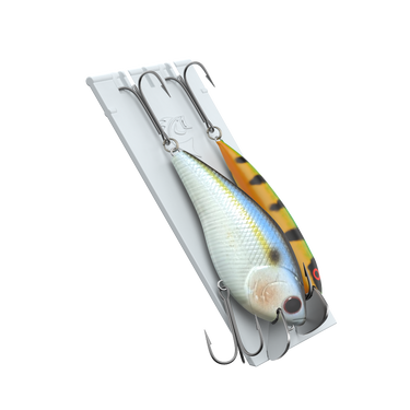 The Hangr's Infinity Divider Technology allows for secure, customizable storage of various bait sizes, including treble hooks. Its snug-fit notches keep baits in place, even in rough water, while maximizing space for bulk storage.