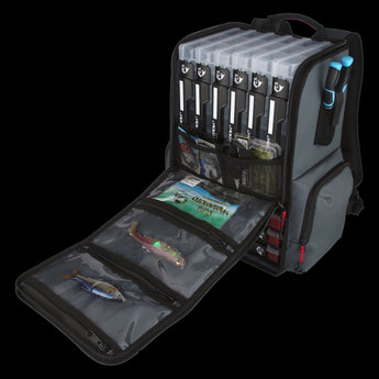 Exterior features include a side slip pocket capable or holding two rod combos, two more storage pockets, and a plier holder. The Largemouth Backpack 3.0 comes equipped with three 3600 Drift Quiklatch trays ensuring lures are organized and protected. Constructed using a reverse Rip Stop material ensures protection against inevitable wear and tear for the mobile angler.